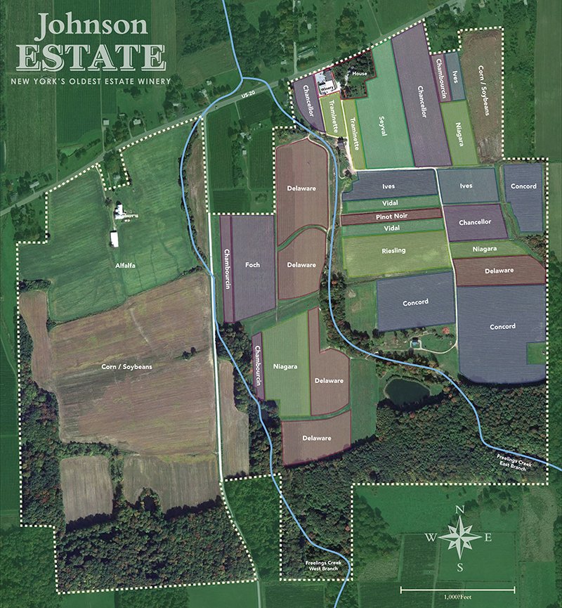 Johnson Estate grows thirteen grape varieties across 115 acres of estate vineyards along Lake Erie. Over the decades, our plantings have evolved — from the region’s historic native grapes, to the French-American hybrids that helped pioneer fine wine here, to classic vinifera like Riesling and Pinot Noir.
